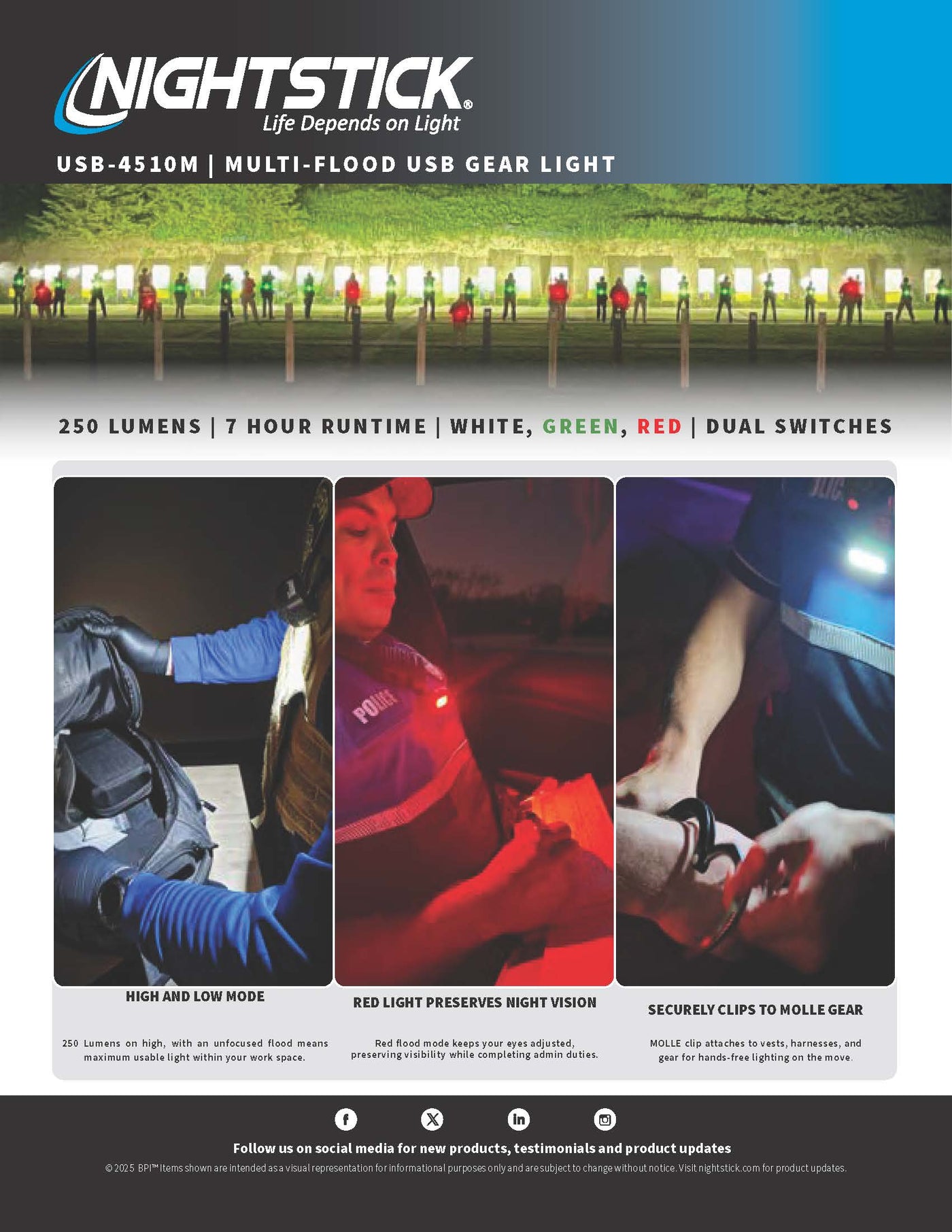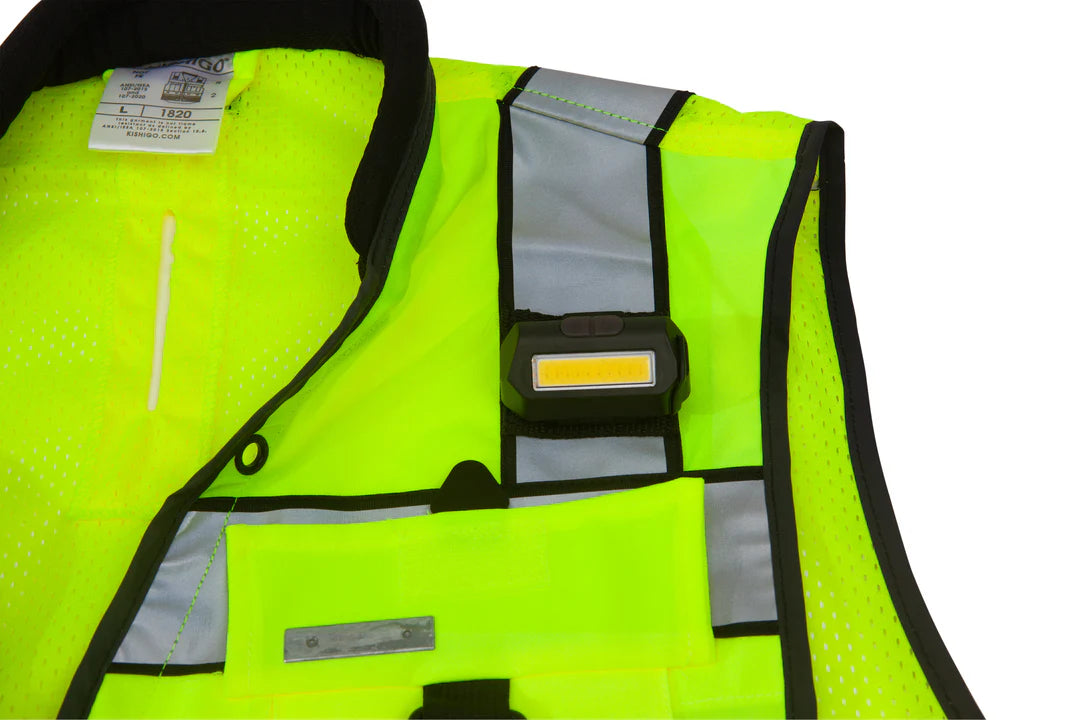 The USB-4510M Multi-Flood USB Gear Light is a lightweight area floodlight with selectable white, green, or red LEDs. It clips firmly to mic loops, MOLLE, or PALS webbing on tactical and industrial safety vests, backpacks, and gear bags. This makes it ideal for law enforcement and jobsite crews.