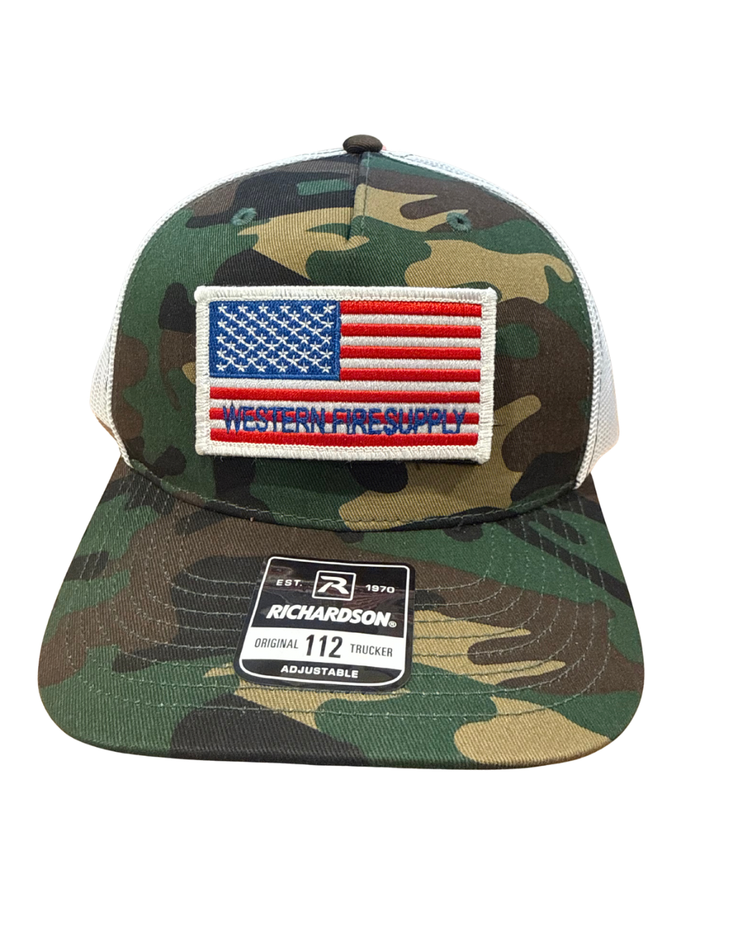 Western Fire Supply camo trucker hat featuring a removable American Flag patch. This SnapBack hat is fully adjustable for a comfortable fit, combining breathable mesh, durable construction, and versatile patriotic style—perfect for everyday wear, work, or the outdoors.