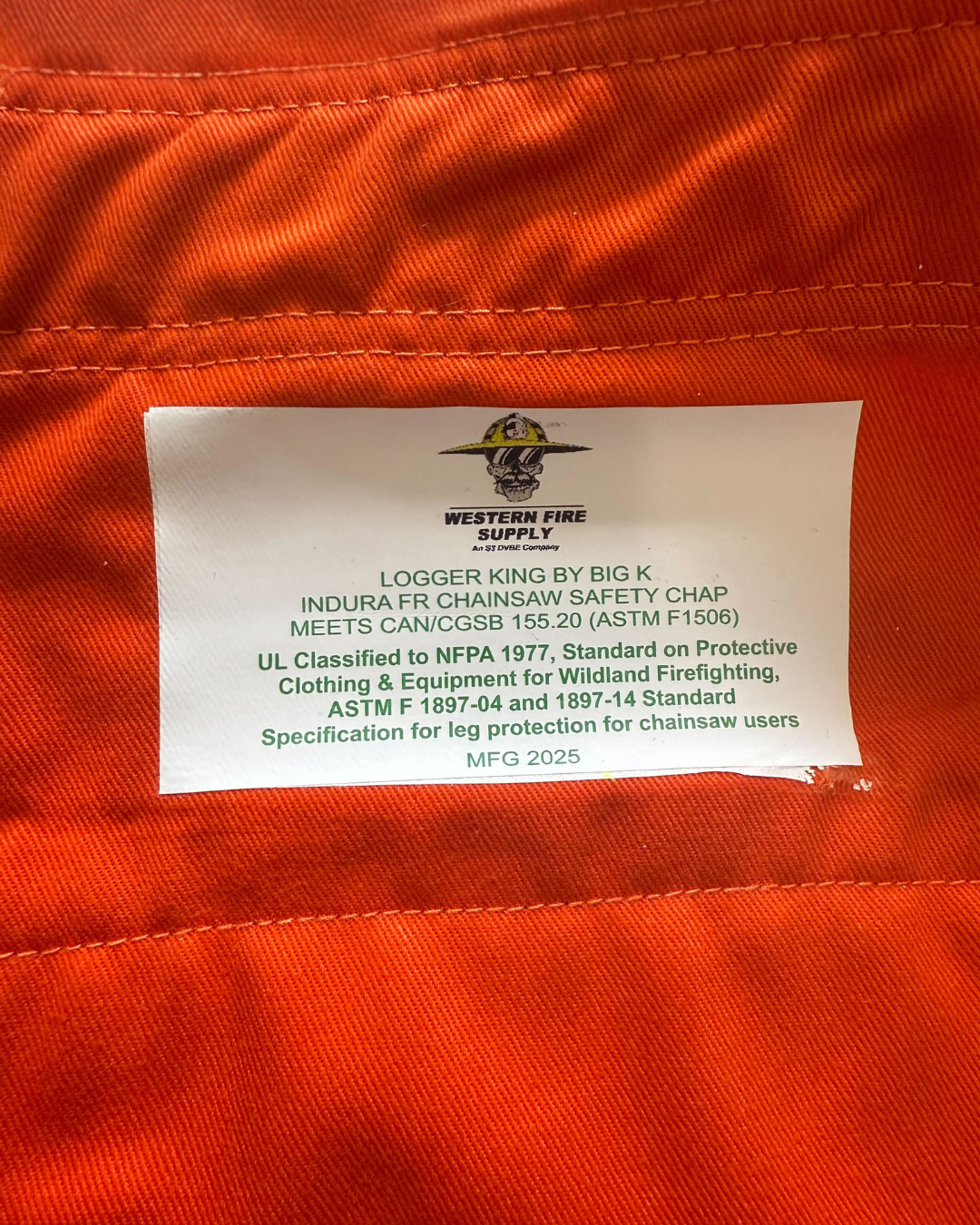The Western Fire Supply Chainsaw Chaps are built for professionals who demand reliable protection in wildland firefighting, forestry, and chainsaw operations. Made with Indura® FR fabric, these chainsaw safety chaps are designed to deliver durability, comfort, and trusted performance in high-risk environments. They meet CAN/CGSB 155.20 (ASTM F1506) standards and are UL Classified to NFPA 1977, the recognized standard for protective clothing and equipment used in wildland firefighting.